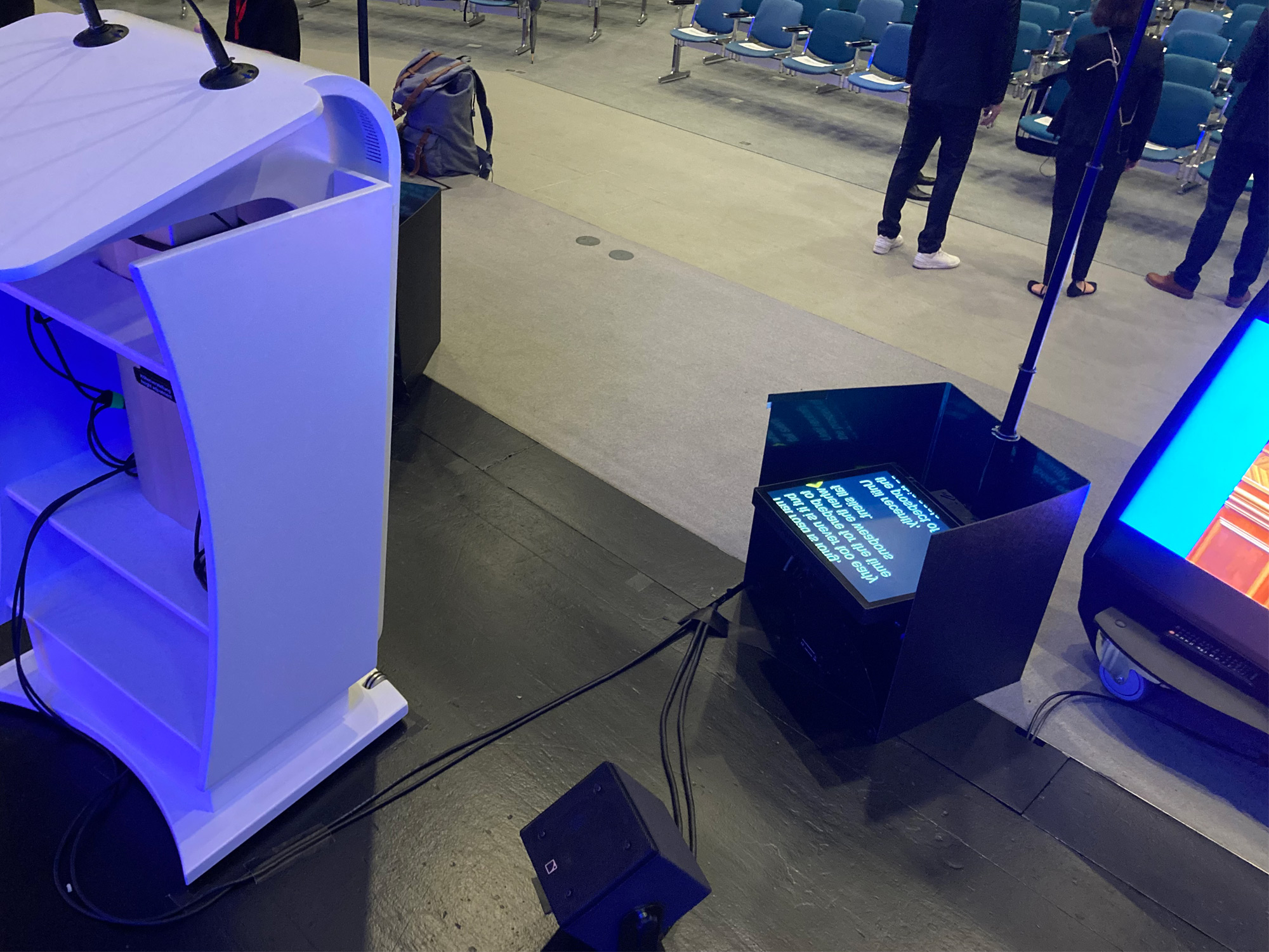 Conference teleprompter systems or presidential systems consist of one or two special high-contrast and very bright flat screens, which are placed flat on the floor in front of the lectern or embedded in the stage. Above these screens, on a mobile or fixed, thin tripod, are semi-transparent mirrors that are almost "invisible" to the auditorium.