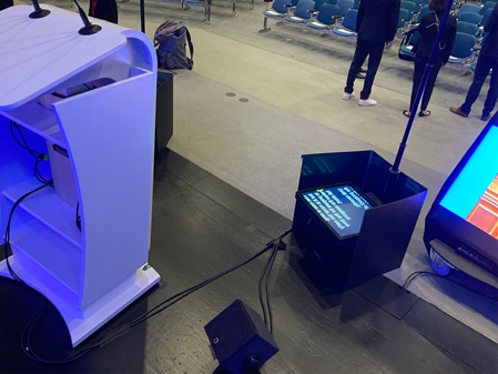 Another possible variant is a conference teleprompter (presidential mirror). During lectures and speeches, two lightly tinted glass panels are mounted on thin stands in the left and right areas of the speaker's field of vision. The corresponding monitors are placed on the floor. In the center, an unobstructed view is left for cameras of the press and the audience.